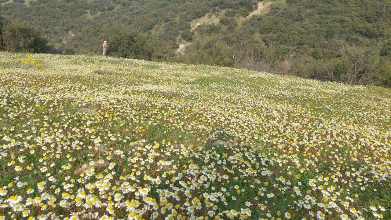 Manisa'nın Sarıgöl ilçesinde şubat ayında yağan bol yağışların ardından dağ yamaçlarında papatya ve çeşitli kır çiçekleri yoğun şekilde açtı. Doğadaki bu bolluk, arıcılıkla uğraşan üreticilerin yüzünü güldürdü.