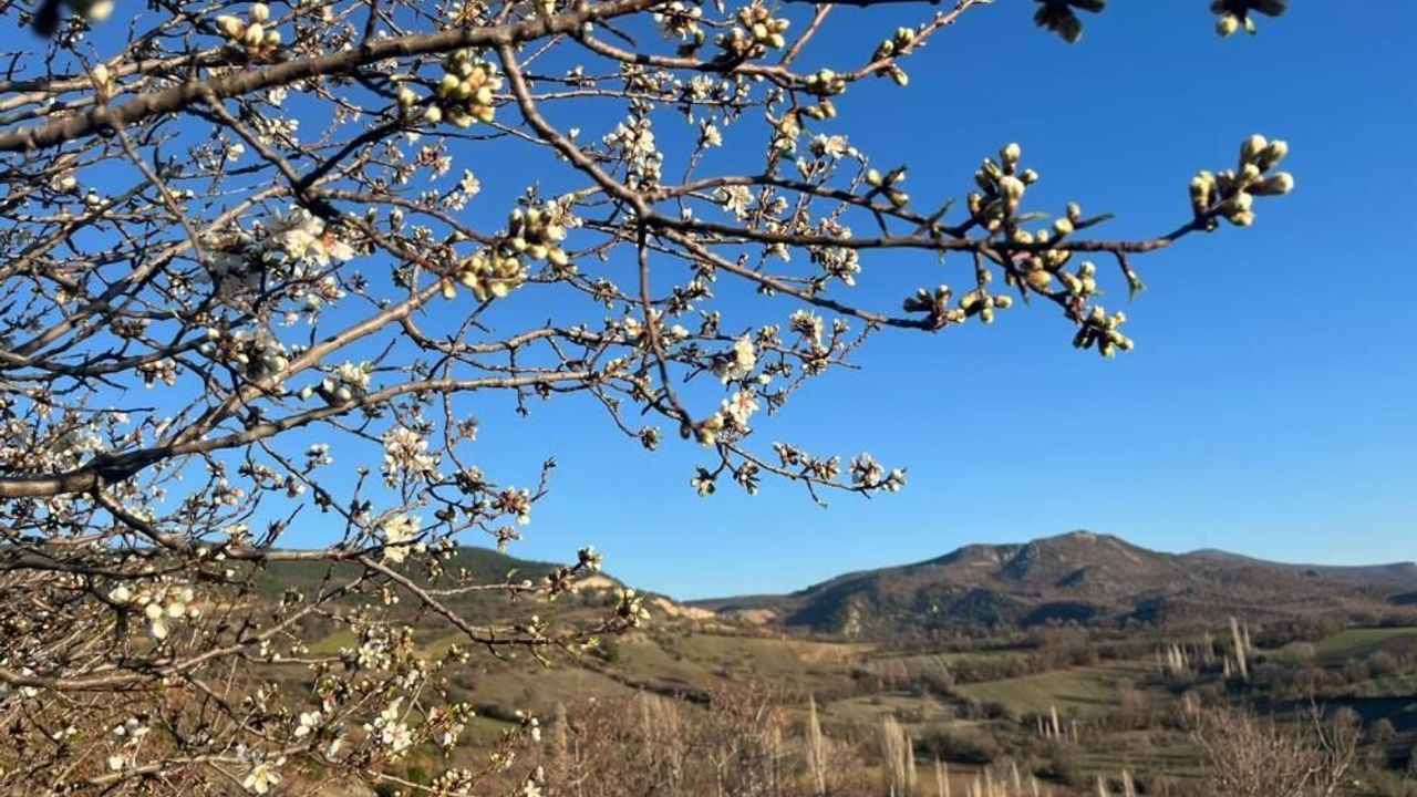 Kütahya'nın Emet ilçesine bağlı Sülye köyünde, hava sıcaklıklarının mevsim normallerinin üzerinde seyretmesiyle birlikte badem ağaçları çiçek açtı. Beyaza bürünen ağaçlar, kartpostallık görüntüler oluşturdu.