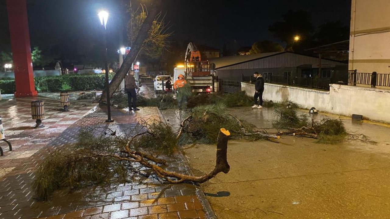 Manisa'nın Alaşehir ilçesinde etkili olan şiddetli yağmur ve rüzgar, yarım asırlık çam ağacını devirdi.